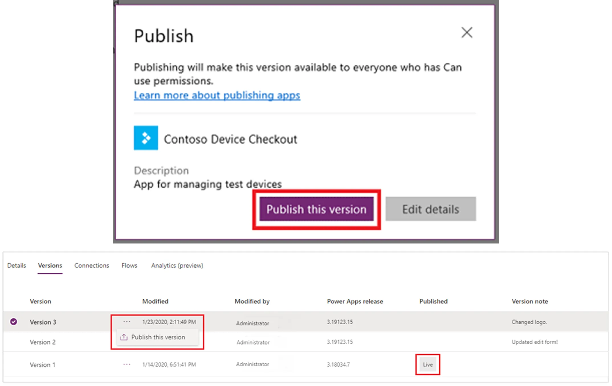 Cuando terminen de realizar cambios, deben publicarlos explícitamente para que estén disponibles para todas las personas con las que se comparte la aplicación.