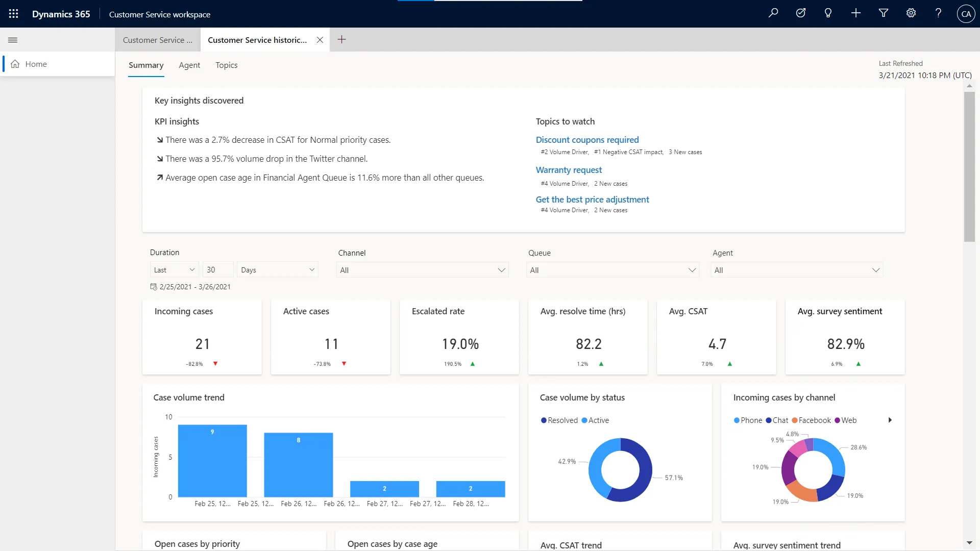 Dynamics 365 Customer Service Insights te ayuda a medir el rendimiento en tiempo real de tus agentes de atención al cliente y descubrir oportunidades para mejorar los procesos y las personas. Esto podría ser tan simple como un temporizador de SLA en tiempo real para ayudar a los agentes a priorizar su carga de casos, mantener un indicador visual de problemas en tendencia y ofrecer un servicio proactivo y ágil.